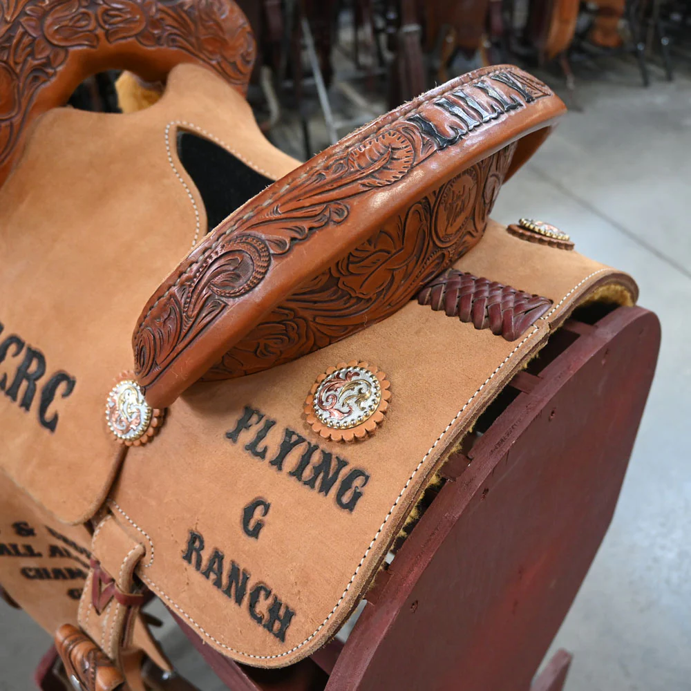 This used 12.5" Jeff Smith Jackie Ganter barrel saddle comes in a light oil floral and trophy tooling with a hard inlay seat. For more information call a saddle salesman today at 888-955-2955.