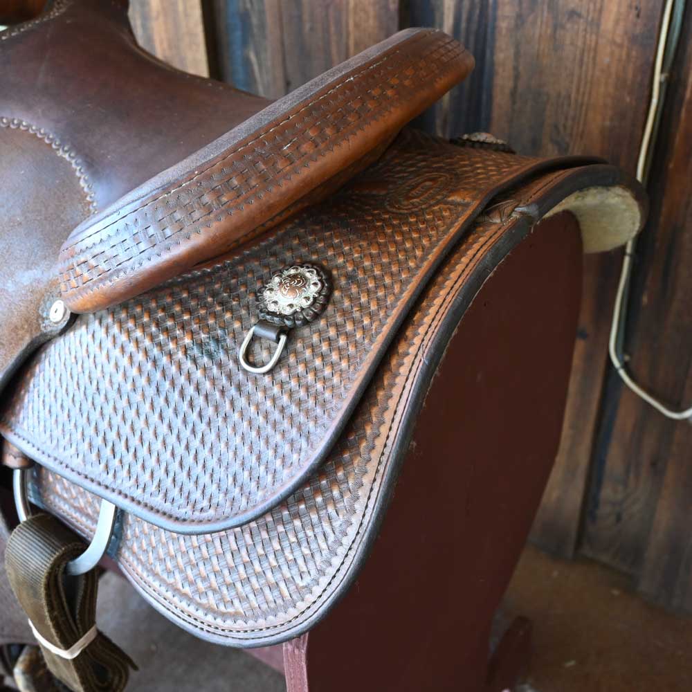 This used 14.5" Gary Lynn Johnson Roping saddle comes in a heavy oil basket tooling with a padded seat. For more information call a saddle salesman today at 888-955-2955.