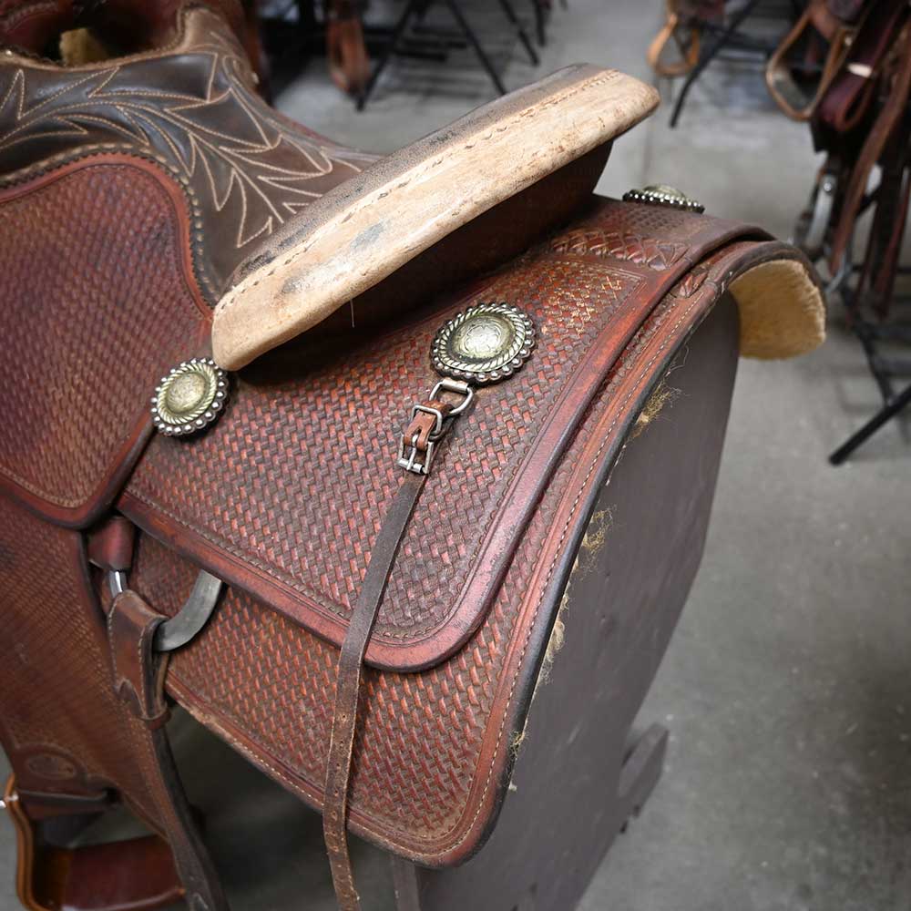 This used 14" Bob's Custom Roping saddle comes in a heavy oil basket tooling with a padded seat. For more information call a saddle salesman today at 888-955-2955.