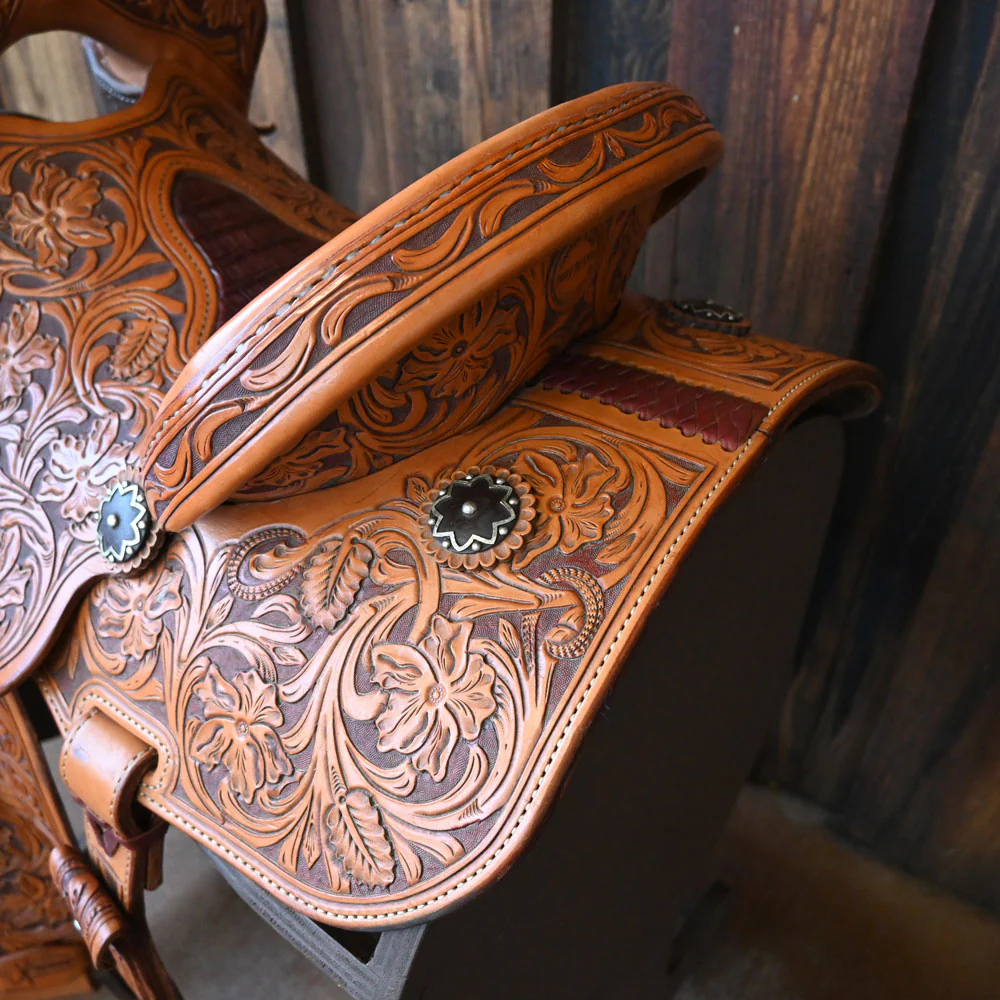 This used 14" Jeff Smith Xtreme Barrel saddle comes in an antique floral tooling with a hard inlay seat. For more information call a saddle salesman today at 888-955-2955.
