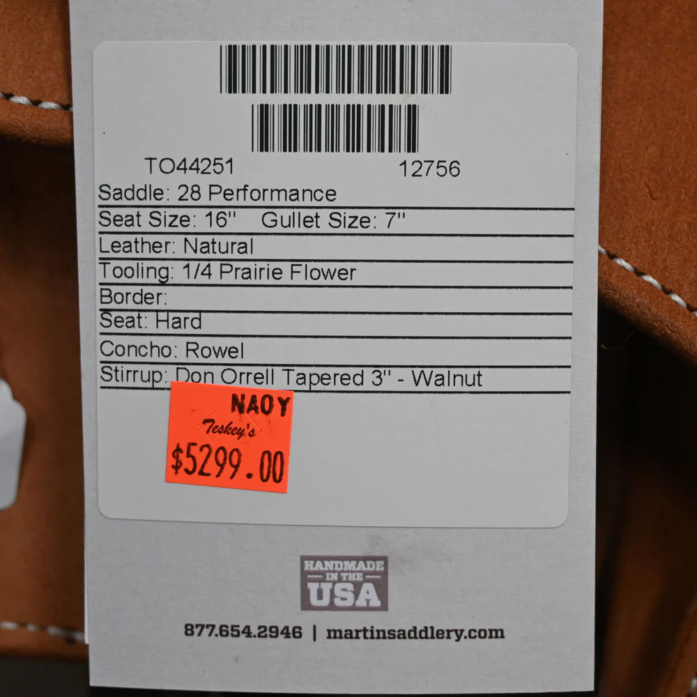This new 16" Martin Performance saddle comes in an antique 1/4 prairie flower tooling with a hard seat. For more information call a saddle salesman today at 888-955-2955.