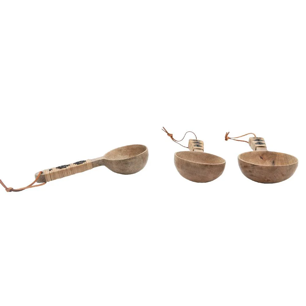 8-1/2"L, 7-1/2"L & 7"L Mango Wood Scoops w/ Patterned Rattan Wrapped Handles & Leather Ties, Set of 3